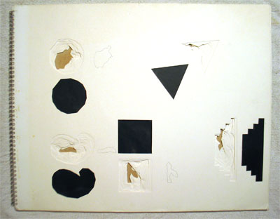 1 On the first page of your sketch book, make a mark with the ink-charged brush. 2 Wait for the ink to dry. 3 Place the cut mat or thick cardboard under this page and taking the scalpel blade, cut in straight lines around it. 4 Remove the ink mark and place it to the side of the hole. 5 Coat the blank side with glue and stick it down to the side of the hole. 6 Take up the inked brush again and in one movement make a mark within the boundaries of the hole on the paper page revealed. 7 Turn the page and repeat steps 2 to 6 until you have completely penetrated the sketch book.
