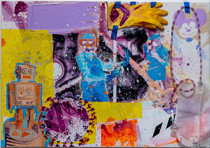 | "Don, Doff, Sleep, Repeat", oil & acrylic paint, rubber glove & catheter bag on canvas, 2023. | ||
