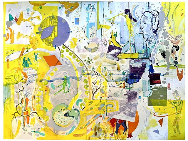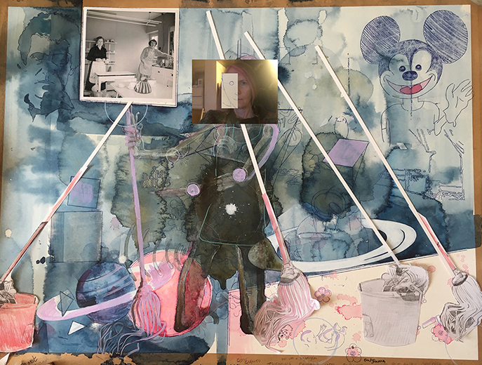 "Mops, Mums & Mickey (Mme. Matisse wearing Marigolds)", 2022-2023, watercolour and collage on paper, 58.5 cm H x 76.2 cm W In this picture I show mopping and wearing yellow Marigold gloves as a way to restore order to a cosmos out of balance, with the mop han- dles as dynamic as lazerbeams, and the mop-men coming to back-up Mme. Matisse. The grocery delivery van is arriving and Mickey Mouse is keeping our spirits up, amongst this eternal drudgery and unrelenting domesticity. |