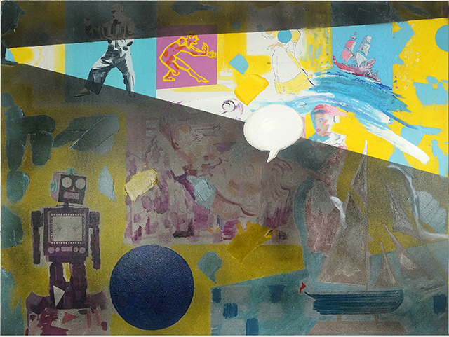 | "Mops, Mums & Mickey", 2022-2023, watercolour and collage on paper, 58.5 cm H x 76.2 cm W | ||
