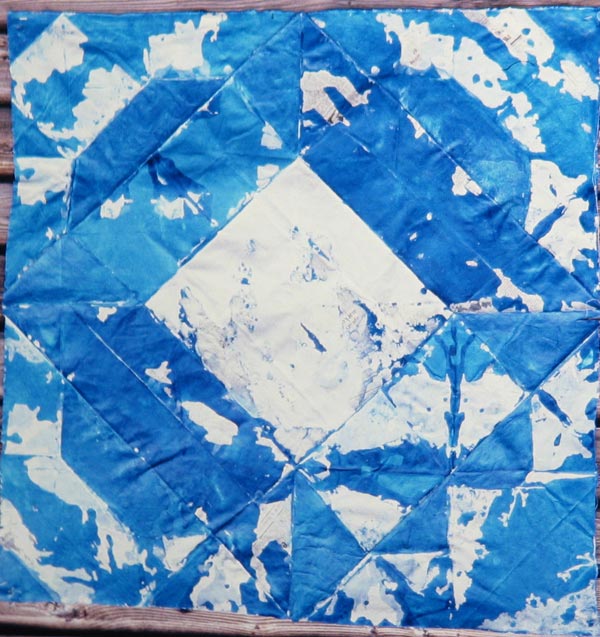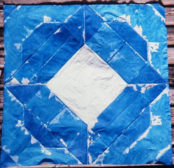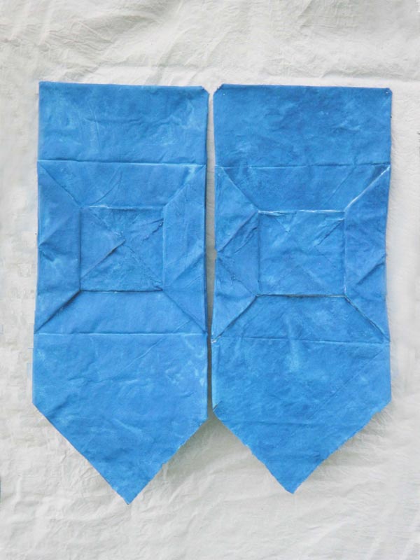 My work was made flat on the studio floor, which was protected by a polythene sheet. I painted the canvas after folding it into origami shapes. Blue flags.