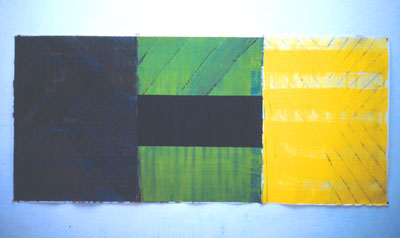 Of course Matisse must have had a process when making his work, but what I came to understand at Bath Academy is what process does when it is the subject of the work. Lalic, at that time the Fine Art Fellow, with her salt-pan-like distillations of paint pools Ð drying horizontally and Crumplin with his arm and hand gestures frozen in plaster Ð both made non-picturing work, drawing upon Process. Colin's work developed into spreading oil paint on one half of the canvas's area and then folding the other side over creating chance marks without a brush. These marks would then be replicated by hand and brush on the other side of the painting, combining process with representation.   (As opposed to Michael Craig-Martin a former BAA lecturer who made Ôpicturing work' concerned with representation of recognisable everyday forms). They were a direct influence on me, together with the American Robert Morris.