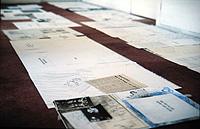 Documentary Evidence: The lists turned into a gathering of evidence. Narrative strings emerged from the mass of collected stuff. I paid typsetters to set it all in long galleys of text and b&w images. Extracting summary phrases from the texts I made slide projection pieces which were an end in themselves, using pure colour, light and brief narrative sequences. They used aphorisms, short pithy statements which I had extracted from my semi-fictional autobiographical alphabeticised text list, and had the potential to rival advertising hordings in their scale.