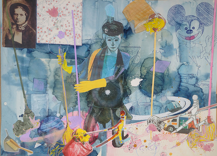 "Mops, Mums & Mickey (Mme. Matisse wearing Marigolds)", 2022-2023, watercolour and collage on paper, 58.5 cm H x 76.2 cm W In this picture I show mopping and wearing yellow Marigold gloves as a way to restore order to a cosmos out of balance, with the mop han- dles as dynamic as lazerbeams, and the mop-men coming to back-up Mme. Matisse. The grocery delivery van is arriving and Mickey Mouse is keeping our spirits up, amongst this eternal drudgery and unrelenting domesticity. |