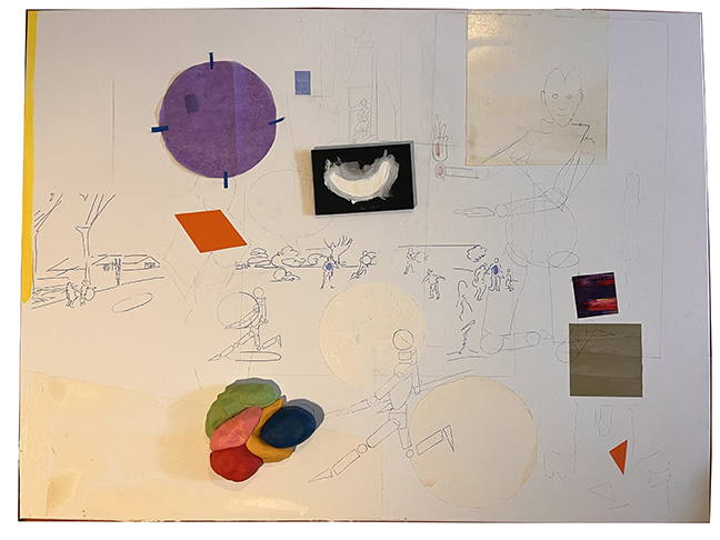 PAINTING: The theme of FUNDAMENTAL STRUCTURES, a basic recurring foundation for a series of paintings, referencing the theatricality of modern life. Consisting of a stage platform, standing figure, circle, smaller robotic figure and a series of hanging flats along the top edge. Sometimes flipped over from Right to Left, to mix it up, and try stuff out. With Matisse, Arp, De Chirico references, and paying homage to Eon Productions, producers of James Bond and also Gone with the Wind, the 1939 American epic historical romance film adapted from the 1936 novel by Margaret Mitchell. The film was produced by David O. Selznick of Selznick International Pictures and directed by Victor Fleming. | |
